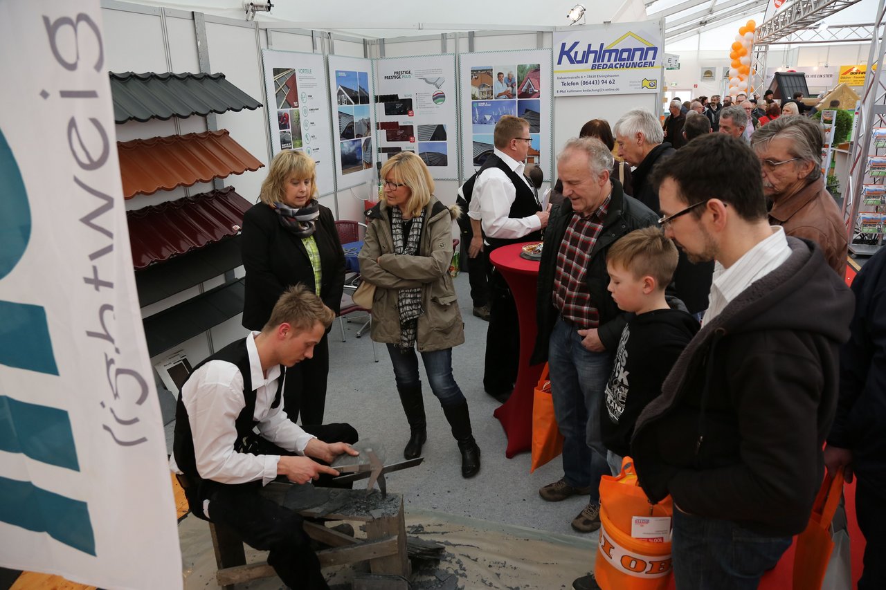 Besucher, die sich mit Informationsmaterial eingedeckt haben, durchstreifen die Gänge der neun Hallen. Sie sind bepackt mit gefüllten Taschen und Eimern, während sich die kleinen Gäste über Luftballons freuen. Bei ihrer 22. Auflage kann Hessens größte Baumesse, die BAUExpo, insgesamt 15.500 Besucher an vier Veranstaltungstagen verzeichnen.